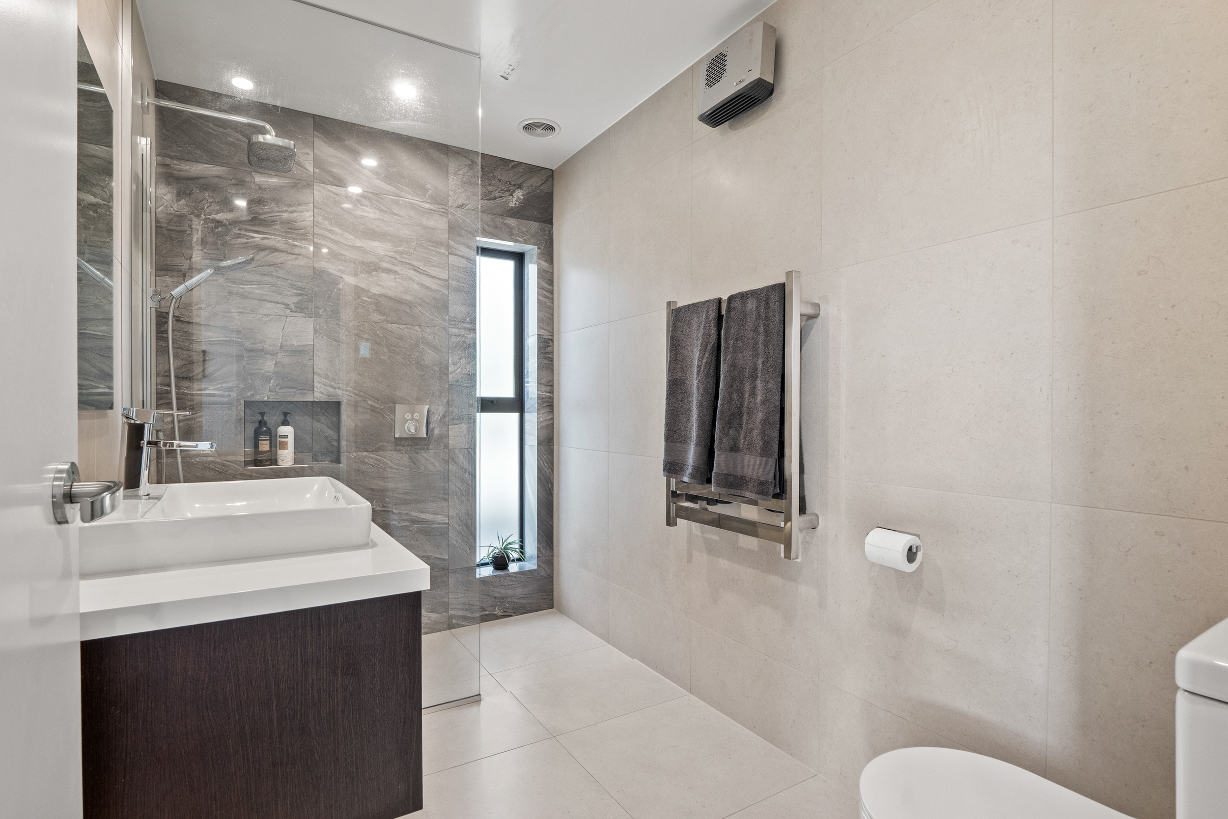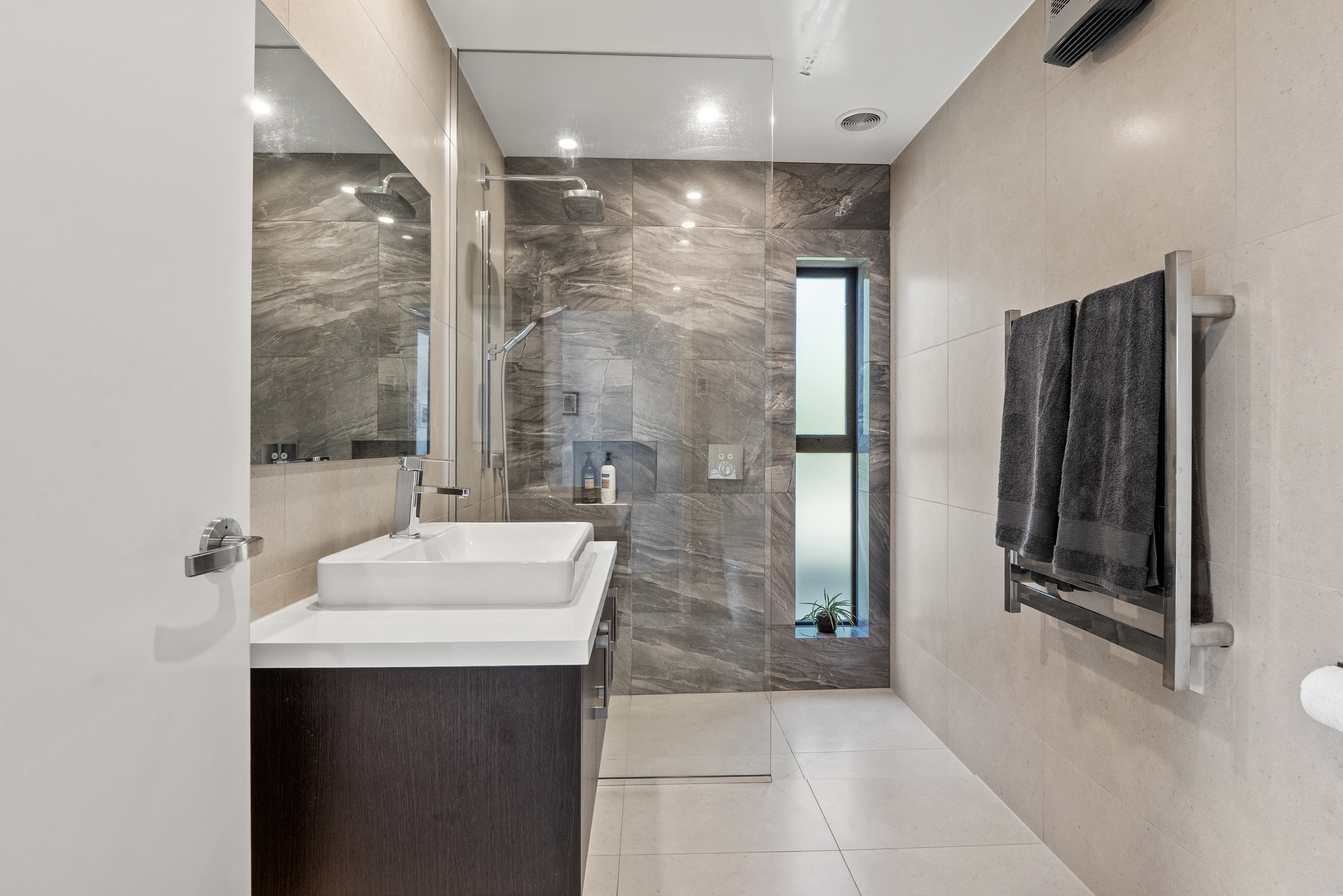 At the centre of the home is a generous kitchen connected to spacious open-plan living and dining areas. A second living area provides flexibility for families and a relaxing cosy haven. A 10 kW Escea gas fire adds warmth and ambience, while an integrated Sonos audio system and engineered hardwood floor enhances the relaxed, contemporary feel.